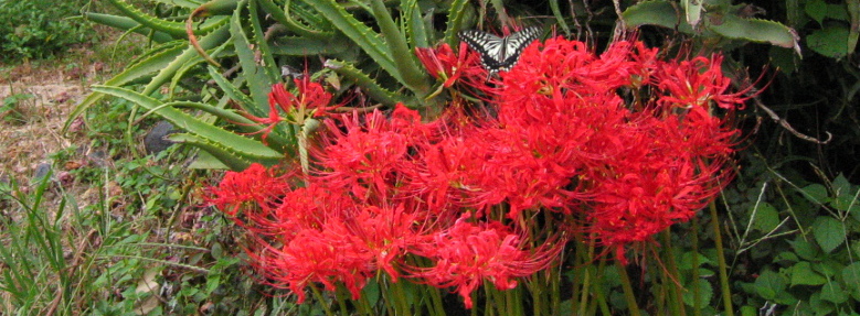 今日は曇ってた分(昨日より1時間近く余分に自転車漕いでたんだけど)体力的には平気だったんですが、やはり時期がちょっと早いのと、少し前に土手の草刈りをやったみたいで、群生という程の曼珠ちゃんの群れは拝めませんでした。残念。でも、自転車でうろうろしてたら偶然白曼珠ちゃんを発見したので記念撮影したのと、偶然ですがアゲハ蝶が一緒に映り込んでるのがありました。そういう意味では雨降るかもしれんなーと思いつつ出かけた甲斐がありました。